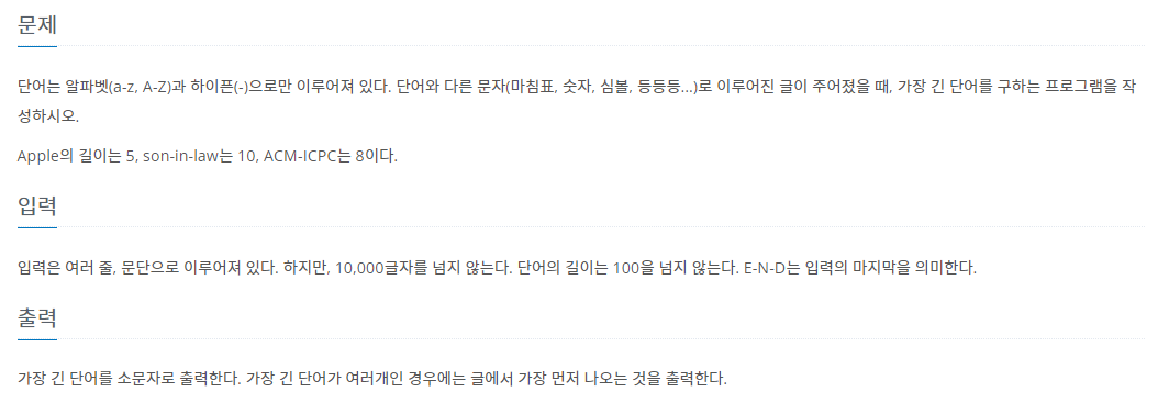단어는 알파벳(a-z, A-Z)과 하이픈(-)으로만 이루어져 있다. 단어와 다른 문자(마침표, 숫자, 심볼, 등등등...)로 이루어진 글이 주어졌을 때, 가장 긴 단어를 구하는 프로그램을 작성하시오. Apple의