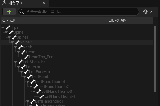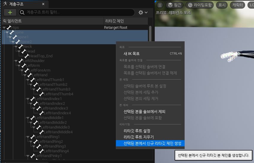먼저 척추에 해당하는 뼈들을 쉬프트로 한 번에 묶은 다음 리타깃 체인 생성을 누른다.
