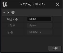 그럼 아래 사진과 같은 창이 뜰 것인데, UE 5.1에서는 해당 뼈가 속한 트리의 최상위 노드 이름을 자동으로 지정해준다. 혹시나 뼈의 이름과 완전히 다른 이름이라면 고쳐주고 확인을 눌러주자.