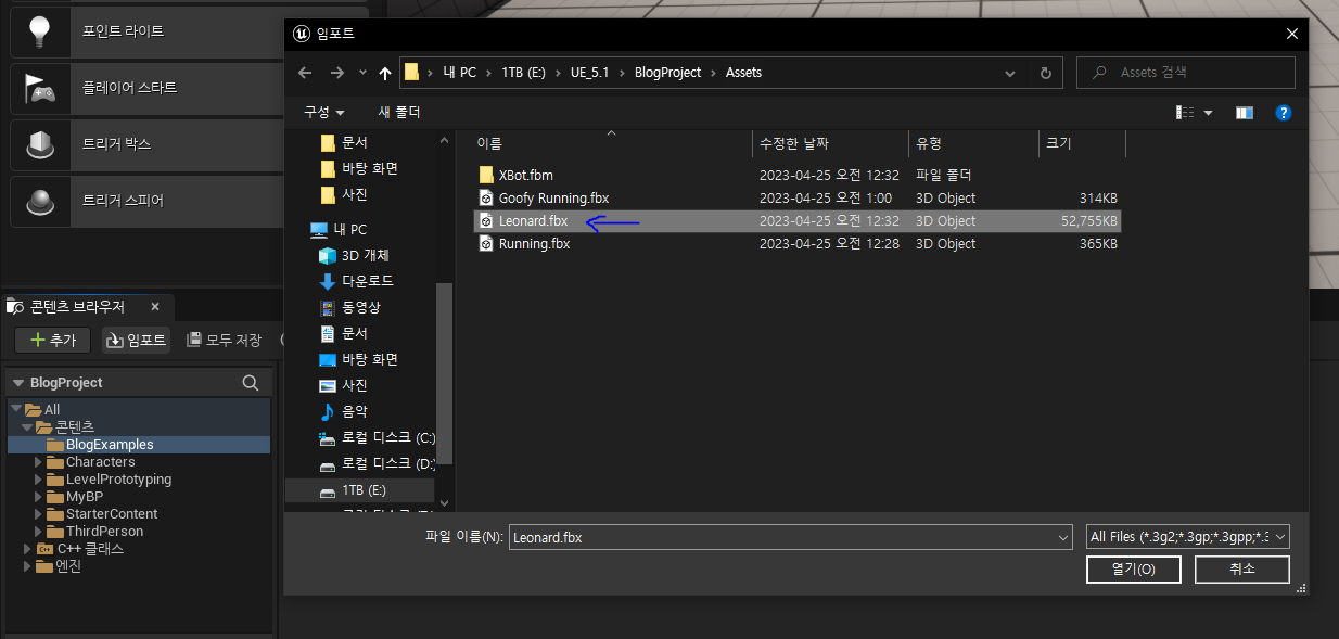 언리얼 엔진 에디터 내부에서 폴더를 하나 만들고 아까 다운 받은 캐릭터를 먼저 임포트해주자.
