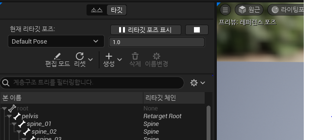 이 캐릭터는 골반뼈 (Leonard는 hips) 위에 root가 있는데, 같은 뼈인 pelvis를 리타깃 루트로 설정해주자.