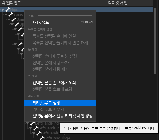 이제 엉덩이 뼈를 우클릭해주고 리타깃 루트로 설정해준다.