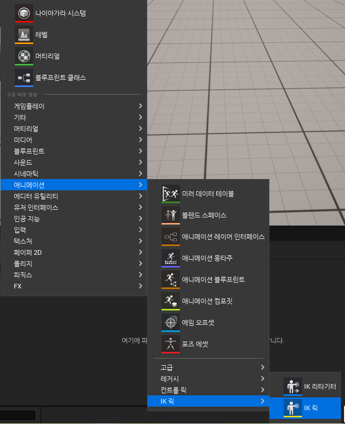 다시 컨텐츠 브라우저에서 오른쪽 마우스 클릭 후 [애니메이션 -> IK 릭 -> IK 리타기터] 를 생성해주자.
