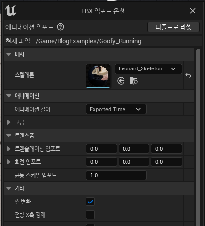 다음으로는 우리가 사용하고 싶은 애니메이션을 똑같이 임포트해 주는데, 스켈레톤은 방금 임포트한 캐릭터의 스켈레톤으로 골라주어야 한다.