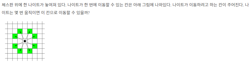 체스판 위에 한 나이트가 놓여져 있다. 나이트가 한 번에 이동할 수 있는 칸은 아래 그림에 나와있다. 나이트가 이동하려고 하는 칸이 주어진다. 나이트는 몇 번 움직이면 이 칸으로 이동할 수