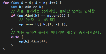 처음 들어가는 숫자라면 [n,1,i]로 넣어주고 그게 아니라면 map 의 key값의 첫번째 값만 증가시켜준다.