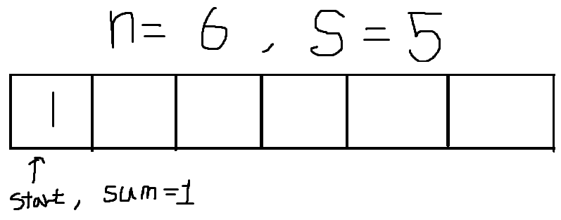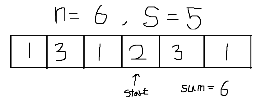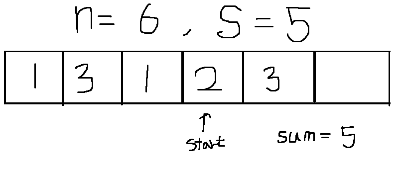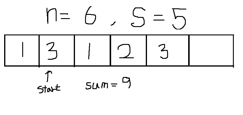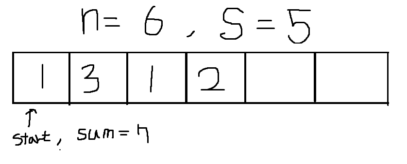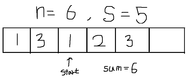현재 누적 합(sum)에서 start 포인터가 위치하고 있는 값을 빼보았을때 그 값이 여전히 S를 넘는다면 Start에 위치한 배열은 쓸모가 없게 된다.
